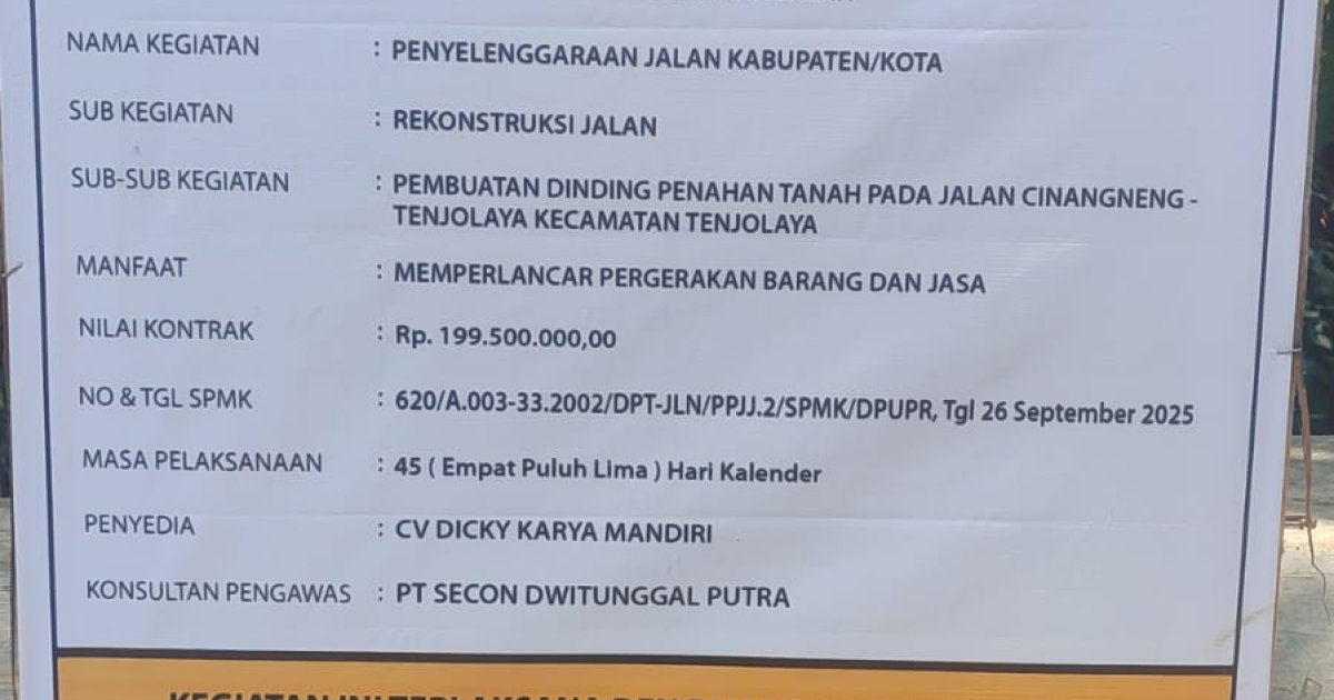 KABUPATEN BOGOR — Dinding Penahan Tanah (DPT) di ruas Jalan Cinangneng–Tenjolaya, Kecamatan Tenjolaya, Kabupaten Bogor, yang baru rampung pada November 2025, kini menunjukkan tanda-tanda kerusakan dini yang signifikan. Retakan memanjang dan amblesnya pelat beton terlihat di sejumlah titik, memicu pertanyaan serius mengenai mutu pekerjaan infrastruktur yang dibiayai Anggaran Pendapatan dan Belanja Daerah (APBD) Kabupaten Bogor Tahun Anggaran 2025 tersebut.